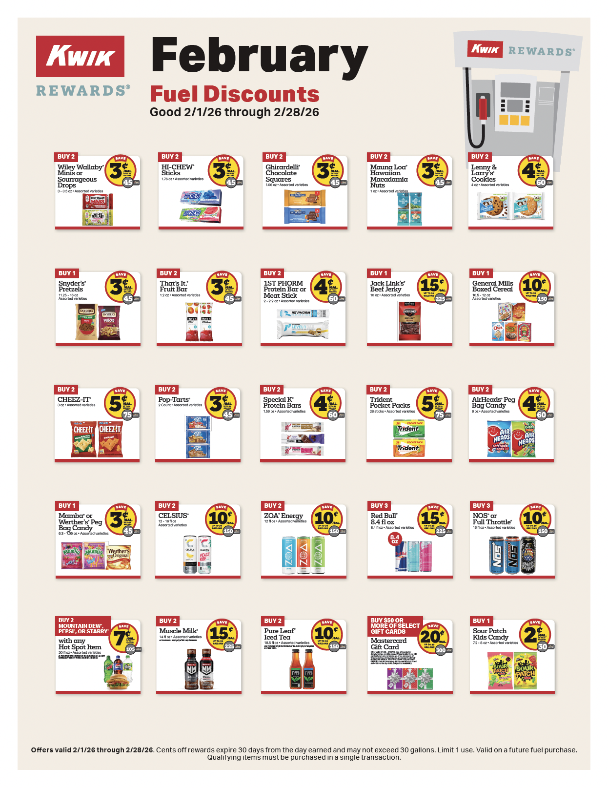 Fuel discounts valid with Kwik Rewards only. Unless noted, offers valid 2/1/26 – 2/28/26.
